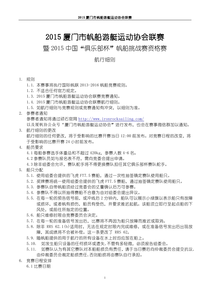 >2015廈門市帆船游艇運動協(xié)會聯(lián)賽航行細則